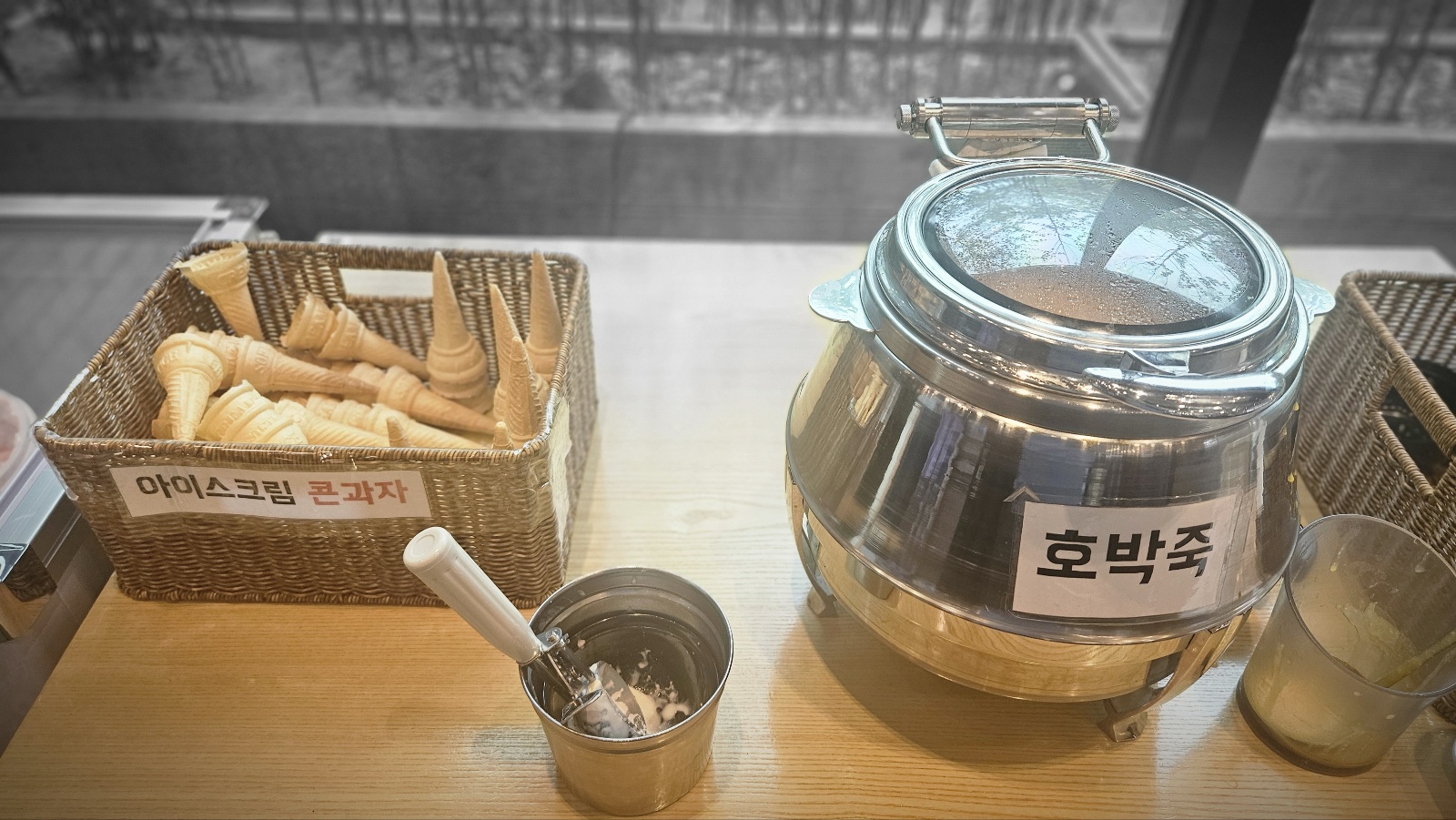 셀프바를 통해 다양한 반찬을 자유롭게 즐길 수 있으며, 호박식혜와 매실음료, 탄산음료도 무료로 제공됩니다.
